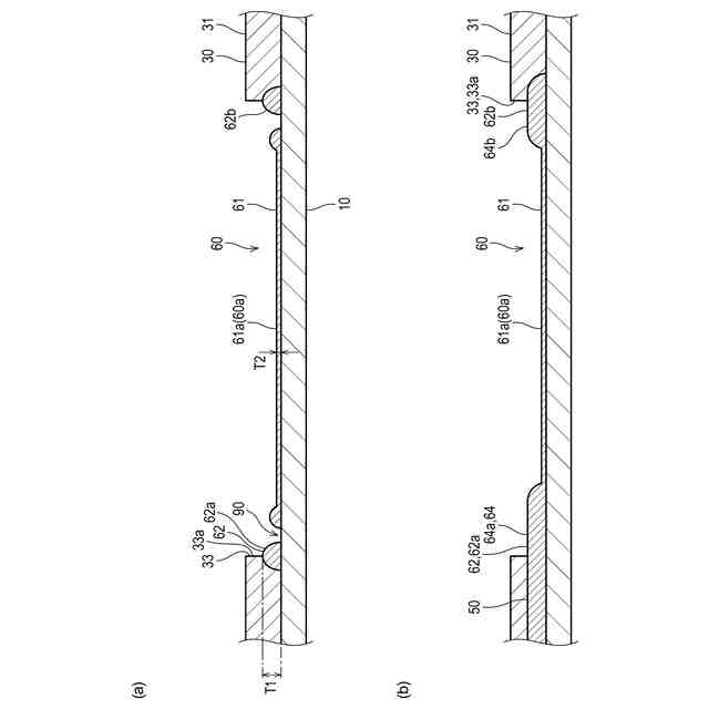 絶縁カバー層30は、電極部60の一部分を露出させる開口33を有する。すなわち、開口33を介して、電極部60の一部分が露出している。電極部60において平面視にて開口33の内周縁33aが重なる部位の膜厚T1(図2(a))が、電極部60の中央部60aの膜厚T2(図2(a))よりも大きい。