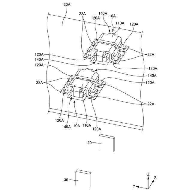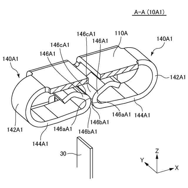 図1は、基板20Aに搭載された実施形態1に係る2つのコネクタ10Aの斜視図である。図2は、実施形態1に係るコネクタ10Aのおもて側の斜視図である。図3は、実施形態1に係るコネクタ10Aのうら側の斜視図である。図4は、基板20A及び外部端子30がコネクタ10Aを介して互いに電気的に接続された状態の側面方向から見た実施形態1に係るコネクタ10A及び基板20Aの部分断面図である。