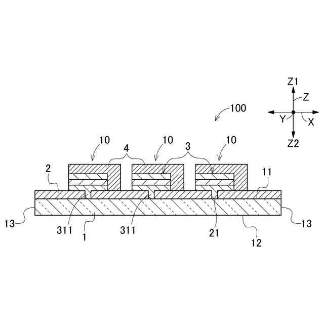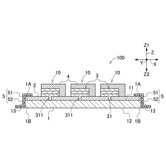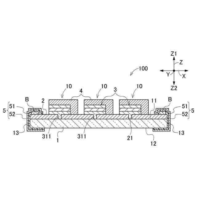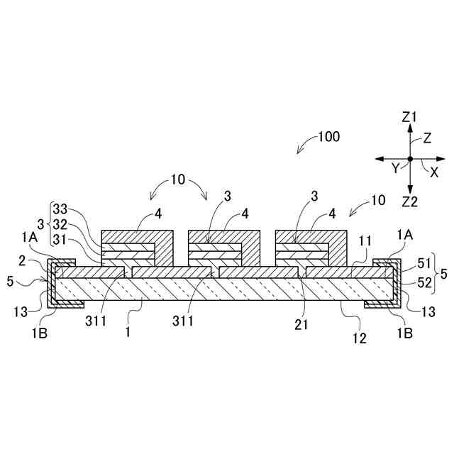 前記基板の前記第一面における第一辺縁において前記導電層と電気的に接続されるように配置され、接着性の接着部と、導電性の導電部と、を有する導電部材と、を備え、
