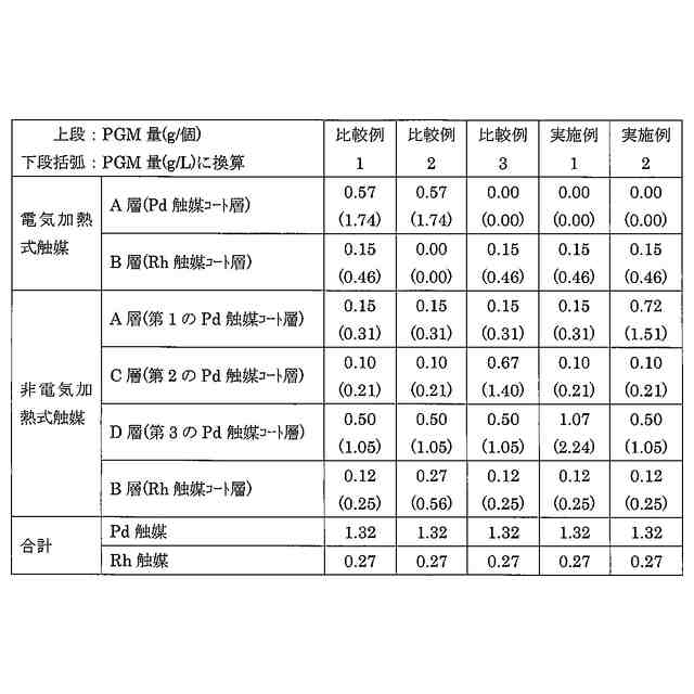 また、下流側に配置された非電気加熱式触媒は、下流側基材に形成された触媒コート層として、Pd触媒コート層(全体Pd触媒コート層及び部分Pd触媒コート層)及びRh触媒コート層(全体Rh触媒コート層)とを有するので、電気加熱式触媒通過後の高温ガスの熱を利用し、Pd触媒及びRh触媒がそれぞれの活性温度に暖気される。また、全体Pd触媒コート層の非電気加熱式触媒単位体積あたりのPd触媒の含有量を、部分Pd触媒コート層の非電気加熱式触媒単位体積あたりのPd触媒の含有量よりも少なくすることで、非電気加熱式触媒の下流におけるPd触媒とRh触媒の合金化を抑え、それぞれの層の金属触媒の浄化性能を発揮することにより、エミッション低減の効果を向上できる。更に、非電気加熱式触媒では、部分Pd触媒コート層を排ガスの流れ方向に沿って非電気加熱式触媒の上流側端面から35%以内の範囲に配置することで、活性温度が低いPd触媒で排ガスを浄化しつつ昇温し、昇温した排ガスを、活性温度が高いRh触媒で浄化することができる。その結果、触媒に使用される貴金属の量を有効に利用できるとともに、暖気時間を短縮し、浄化性能を高め、エミッション低減の効果を向上することができる。