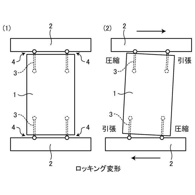 図4(1)は、上記の木質面材1と鉄骨梁2をLSB接合またはGIR接合(接合部3)で接合した構造である。LSB接合やGIR接合は、図4(2)に示すように、主に木質面材2のロッキング変形による木質面材1の端部4の軸力(引抜力)に抵抗させることを想定しており、剛性が非常に高いという長所を持つ一方、スライド変形への効果はそれ程大きくない。このため、図5に示すように、スライド変形によるせん断力に抵抗するための機構5が別途必要となるという問題がある。