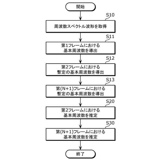 前記複数のフレームのうちの前記第(N+1)フレーム(Nは2以上の整数)の周波数スペクトル波形に基づいて、前記第(N+1)フレームにおける暫定の基本周波数を導出する第(N+1)の導出ステップと、