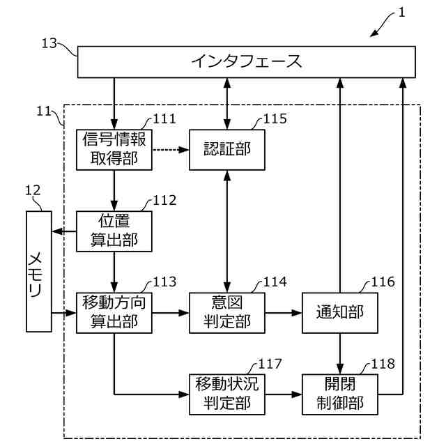 【解決手段】信号情報取得部111は、信号情報を取得する。位置算出部112は、信号情報に基づいて、信号を発した携帯端末3の位置を算出する。移動方向算出部113は、携帯端末3の移動方向を算出する。意図判定部114は、携帯端末3の位置と移動方向とに基づいて、この携帯端末3を所持するユーザUに、空間Aへ入場する意図が有るか否かを判定する。認証部115は、信号情報に含まれる携帯端末IDに基づいて、ユーザUの認証をサーバ装置4に対して要求し、受け取った回答に基づいて、認証結果を意図判定部114に伝える。通知部116は、ユーザUが空間Aへ入場する意図を有している、と判定された場合に、受け取った回答により示される認証の結果をユーザUに通知する。