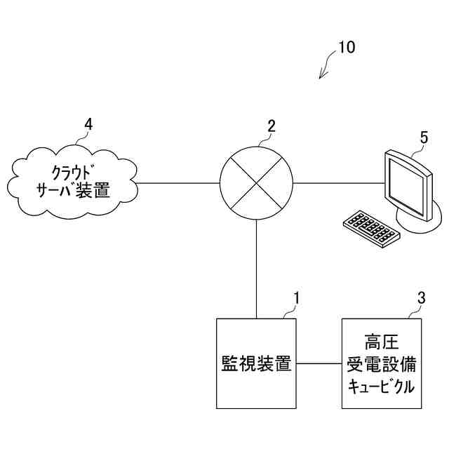 絶縁状態監視システム10は、電気機器が収容されている高圧受電設備キュービクル3内の絶縁状態を監視する監視装置1と、クラウドサーバ装置4と、高圧受電設備キュービクル3の保安・管理を担当する担当者が所持する端末コンピュータ5とを備えてなる。クラウドサーバ装置4は、データセンター等に設置されるものであって、高圧受電設備キュービクル3を識別するための情報と担当者に係る情報とを関連付けたデータベース等を記憶している。また、端末コンピュータ5は、担当者がオフィス等で使用する周知のものであって、表示部や入力部、制御部等を備えているとともに、メール機能を有している。そして、監視装置1、クラウドサーバ装置4、及び端末コンピュータ5は、インターネット2を介して接続されており、後述するように監視装置1から絶縁劣化の発生等を報知する警報信号が出力されると、クラウドサーバ装置4を経由して端末コンピュータ5の表示部に所定の警報表示が表示されるようになっている。なお、端末コンピュータ5に代えて、担当者が携帯するタブレットやスマートフォン等の所謂携帯端末を採用してもよい。