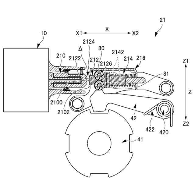 前記第1機構部は、前記可動部材の前記第1方向の直線的な動きに基づいて、前記第1方向に交差する第2方向の力であって、前記ロック部材に作用する力を変化させ、
