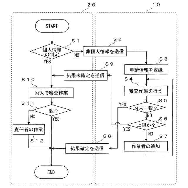 また、請求項3に記載の発明は、請求項1または請求項2に記載の審査作業システムにおいて、前記第2サーバ装置が、前記設問を生成するための情報に個人情報が含まれるか判定する個人情報判定手段を、更に備え、前記個人情報を含まないと判定された場合、前記設問を生成するための情報を前記第1サーバ装置に送信し、前記個人情報を含むと判定された場合、前記第3送信手段が、前記個人情報を含む前記第2審査画面のデータを、前記複数の第2端末装置に送信することを特徴とする。