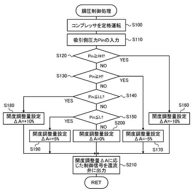 前記制御部は、前記検知部により検出される前記コンプレッサの吸引側の圧力が前記所定圧力範囲の下限圧力よりも高い低圧側閾値以下である場合には、前記制御弁の開度を増加させ、前記検知部により検出される前記コンプレッサの吸引側の圧力が前記所定圧力範囲の上限圧力よりも低く且つ前記低圧側閾値よりも高い高圧側閾値以上である場合には、前記制御弁の開度を減少させ、前記検知部により検出される前記コンプレッサの吸引側の圧力が前記低圧側閾値よりも大きく且つ前記高圧側閾値よりも小さい場合には、前記制御弁の現在の開度を維持する、