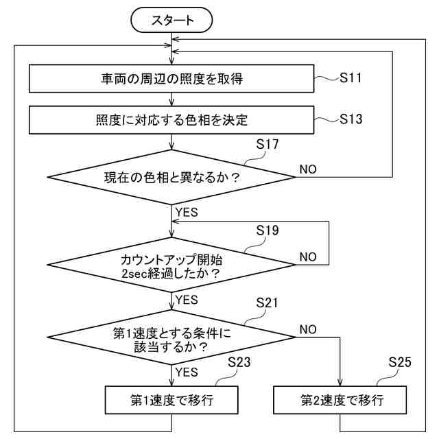 検出した前記照度が変化した場合、変化後の前記照度が所定時間以上継続した後に、前記重畳画像における前記補助表示要素の色相を移行させる、