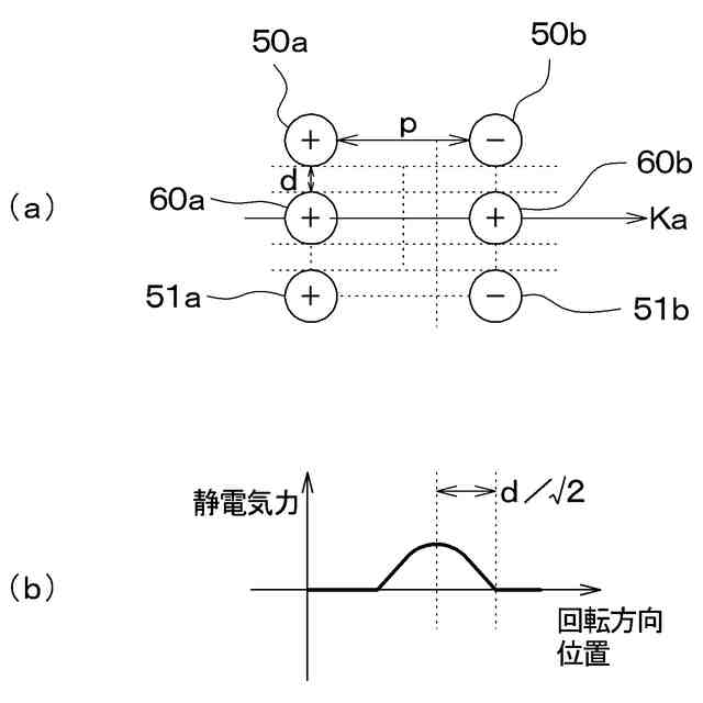 静電モータ1では、ステータ電極50a~50h、51a~51h、52a~52h、53a~53hの全ての極性が負極に設定される。このため、ステータ10に沿面放電が発生しない。ロータ電極60a~60h、61a~61h、62a~62hの全ての極性が、正極および負極のうち一方の極性から他方の極性に順次切り替えられる。このため、ロータ20にも沿面放電が発生しない。よって、ステータ10、ロータ20において、電気絶縁部材を排除することができる。