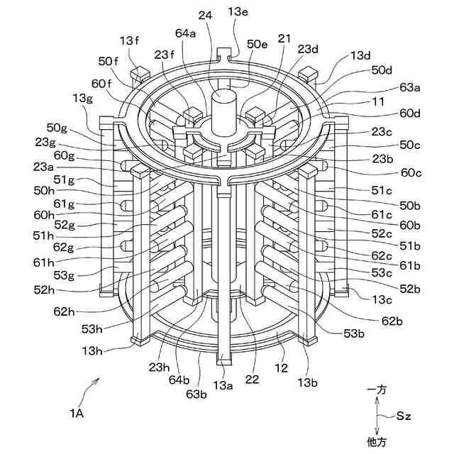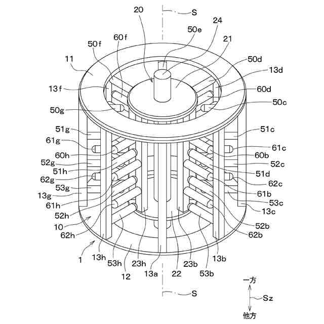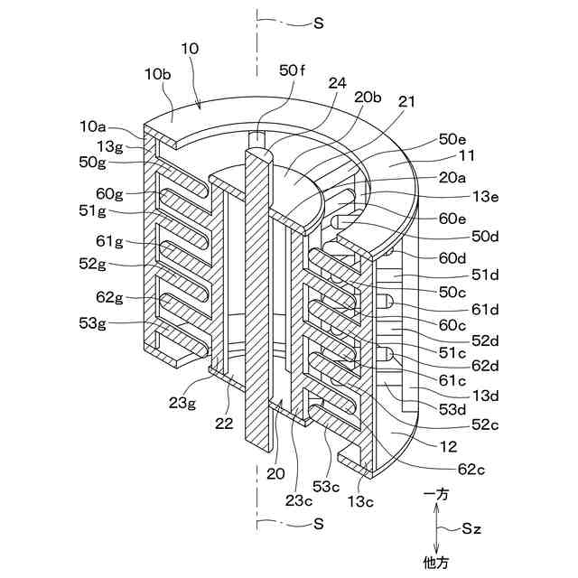 軸線(S)を中心とする円周方向に等間隔に並べられている複数のステータ電極(50、50a~50h、51a~51h、52a~52h、53a~53h)を有するステータ(10)と、