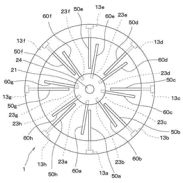 軸線を中心とする円周方向に等間隔に並べられている複数のロータ電極(60、60a~60h、61a~61h、62a~62h)を有し、ステータに対して軸線を中心とする回転方向(Ka)の一方側に回転が自在になるように構成されているロータ(20)と、