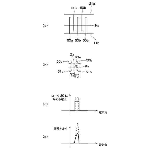 さらに前記制御部は、前記角度センサの検出角度に基づいて、前記回転方向中間位置および前記一方側ステータ電極の間における前記軸線を中心とする第1角度範囲(fb)内に、前記複数のロータ電極が位置すると判定したとき、前記複数のロータ電極の極性を負極に設定することによって前記ロータに前記回転トルクを発生させ、