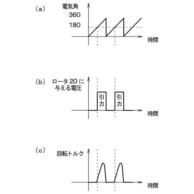 図13の第3実施形態における静電モータにおいて、時間と電気角の関係、ロータ電極に与えられる電圧と時間との関係、ロータ電極に生じる回転トルクと時間との関係を示す図である。