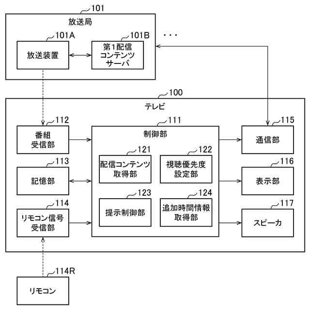 番組受信部112は、各放送局101の放送装置101Aから、放送番組の放送波を受信する。記憶部113は、各種の情報を記憶する。リモコン信号受信部114は、リモートコントローラ(リモコン)114Rからのリモコン信号を受信する。リモコン114Rは、ユーザがテレビ100を操作する際に用いられる操作デバイスである。