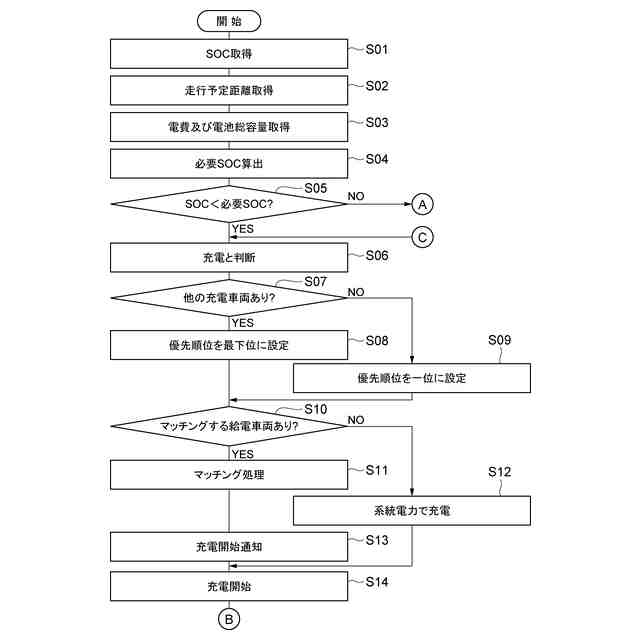 (3)上記(1)又は(2)の充電制御装置において、制御部は、複数の第二車両が存在する場合、複数の第二車両のそれぞれに設定される優先度に基づいて、優先度の高い第二車両から順に、第一車両の条件と第二車両の条件との一致を判断してもよい。この構成では、第二車両が複数存在する場合に、優先度に基づいて条件の一致を判断することができる。そのため、例えば、一の第二車両よりも後に充放電を要求した他の第二車両が、一の第二車両よりも先に充放電が実施される等といった事態が生じることを回避できる。