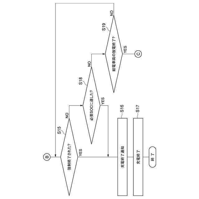 (4)本発明に係る充電制御方法は、第一車両の第一蓄電池と第二車両の第二蓄電池との間において充放電を行う充電器を制御する充電制御方法であって、第一車両の走行予定距離を取得する第一取得ステップと、第一蓄電池の現在の残容量を取得する第二取得ステップと、第一取得ステップにおいて取得された走行予定距離に基づいて、第一車両が必要とする必要電力量を算出する算出ステップと、第二取得ステップにおいて取得された残容量と、算出ステップにおいて算出された必要電力量とに基づいて、第一蓄電池の充電又は放電を判断する判断ステップと、判断ステップにおける判断結果に基づく第一車両の条件と第二車両の条件とにおいて、第一車両の条件と第二車両の条件とが一致した場合に、第一蓄電池と第二蓄電池との間において充放電を実施させる制御ステップと、を含む。