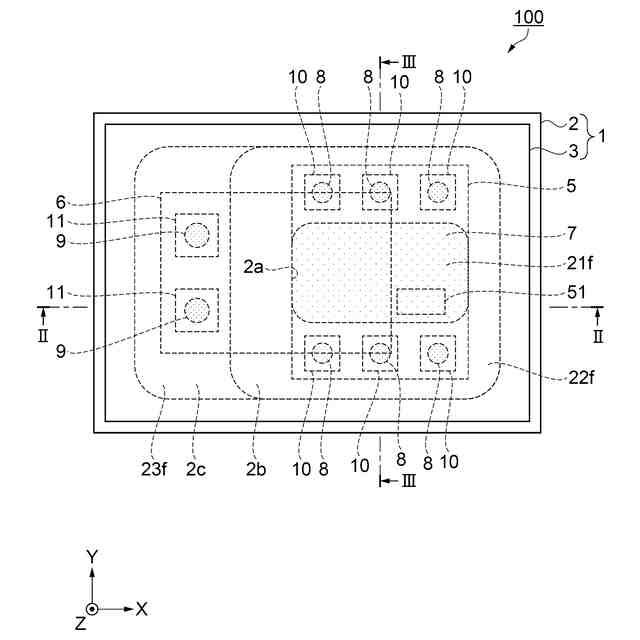 図1は、実施形態1の振動デバイス100の平面図であり、内部の構成を破線で示している。図2は、図1のII-II線に沿う振動デバイス100の断面図である。図3は、図1のIII-III線に沿う振動デバイス100の断面図である。図4は、本実施形態による熱抵抗削減効果を示すグラフである。