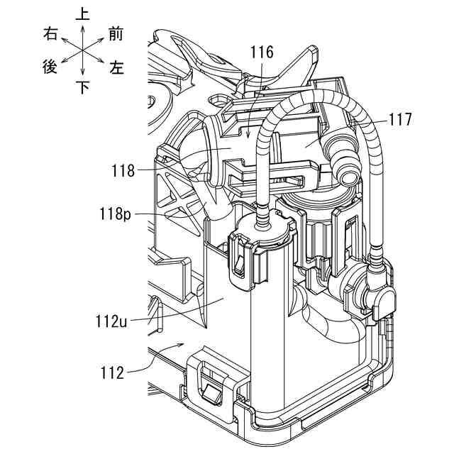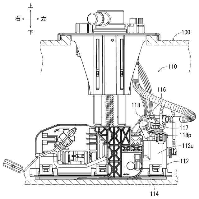 弁ケース116は横向きに設けられており、図9に示すように、ケース本体部117と、そのケース本体部117に対して同軸に連結されるキャップ部118とから構成されている。キャップ部118は、有天円筒状に形成されており、そのキャップ部118の天井部分に前記リリーフ弁から流出した余剰燃料を排出する燃料排出パイプ118pが形成されている。燃料排出パイプ118pは下方に延びるように形成されており、サブタンク112の上角部の燃料受け入れ筒部112uに対して燃料を導けるように構成されている。