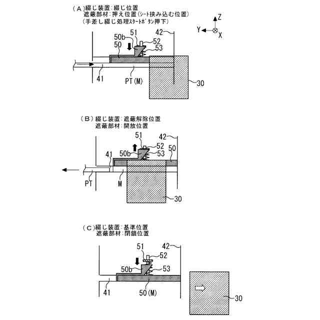 手差し処理部における遮蔽部材と綴じ装置との動作を示す図である。