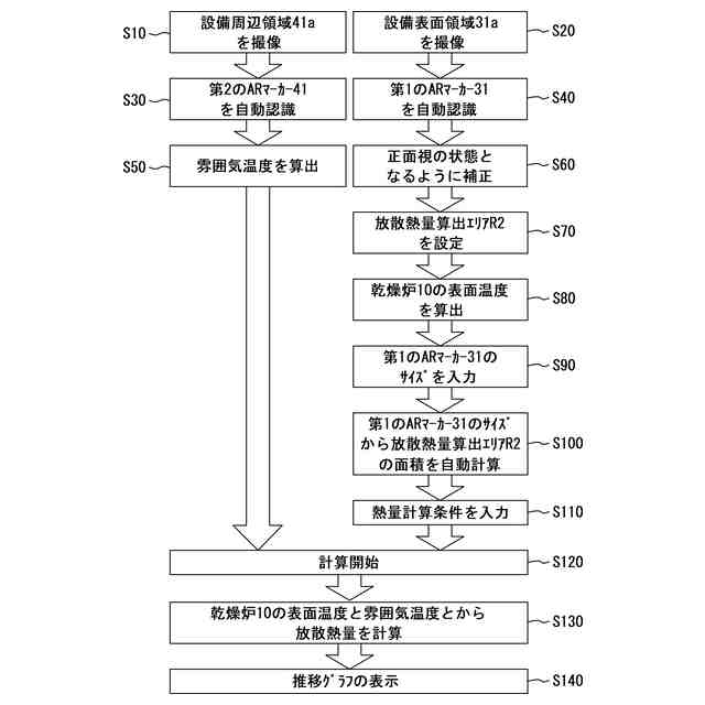 請求項1に記載の発明では、設備表面領域の熱画像に基づいて設備表面温度を算出し、設備周辺領域の熱画像に基づいて雰囲気温度を算出し、設備表面領域の可視画像中に写り込んだ第1のARマーカーの大きさに基づいて放散熱量算出エリアの面積を算出する。そして、放散熱量算出部は、設備表面温度だけではなく、雰囲気温度や放散熱量算出エリアの面積にも基づいて、設備表面からの放散熱量を算出するため、放散熱量を高精度に検出することができる。また、設備表面温度を多数の測定点で測定しなくても、放散熱量の算出が可能となるため、放散熱量を短時間で検出することができる。
