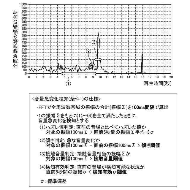 前記所定値以上の前記衝撃が検知された場合に、前記衝撃が検知されたタイミングから所定時間遡った前記音声に短時間フーリエ変換を実行して、前記音声の所定時間ごとの振幅を算出し、