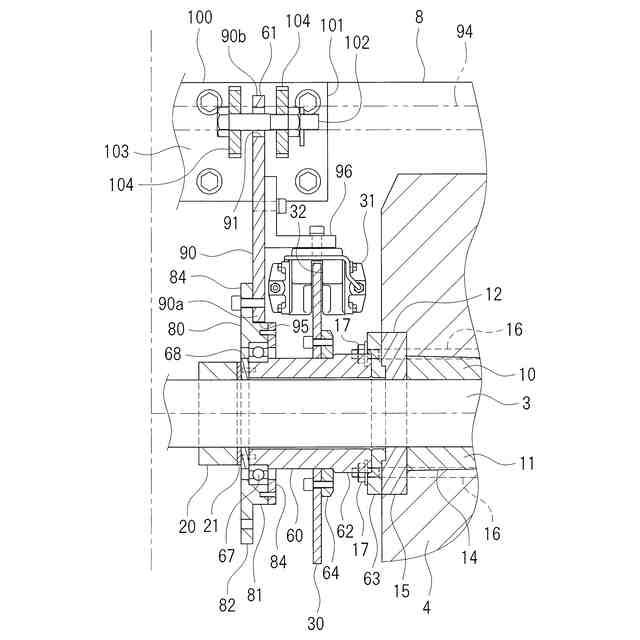 また更に、追従機構部は、地車本体に取り付けられ、キャリパベースの軸方向の移動を案内するベースガイドを備えていることが好ましい。この構成によれば、ベースガイドがキャリパベースの軸方向の移動を案内するので、キャリパベースがスムーズに軸方向に移動でき、それに伴ってキャリパも軸方向にスムーズに移動できてブレーキロータに容易に追従できる。