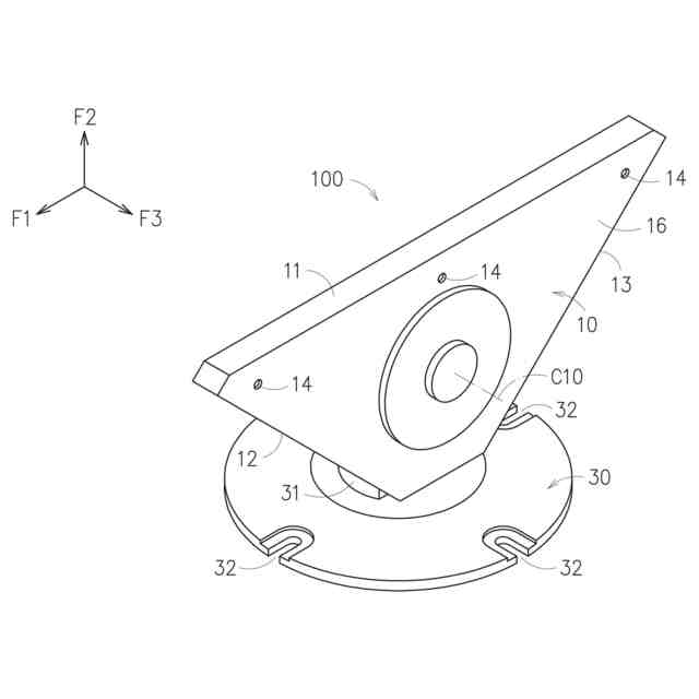 図1~図4を参照し、本体10は、例えば、第1側辺11、第2側辺12、第3側辺13を有する三角形のブロックであるが、本発明は、これに限定されない。3つの側辺は、何れも平坦な面である。