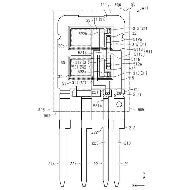 ところで、半導体装置には、半導体装置が流す電流に応じて複数のトランジスタが搭載されるものがある。各トランジスタは、互いに並列的に接続される。つまり、各トランジスタの制御電極と駆動電極は、ワイヤによって1つのパッドに接続される。この場合、例えば各トランジスタの制御電極に接続されるワイヤの長さが互いに異なる。これにより、各トランジスタにおいて、リードと制御電極との間のインダクタンス値(L)や抵抗値(R)等の電気的特性にばらつきが生じる。また、各トランジスタの制御電極への導通経路に起因して、制御電圧の印加が不均一となることが懸念される。このような電気的特性の相違は、各トランジスタの動作、たとえばオンオフのタイミングに影響する。上記の半導体装置は、例えばインバータ回路やDC-DCコンバータ回路に用いられる。このような場合、2つの半導体装置にそれぞれ含まれるトランジスタのばらつきを考慮した大きなマージンの設計が必要となる。
