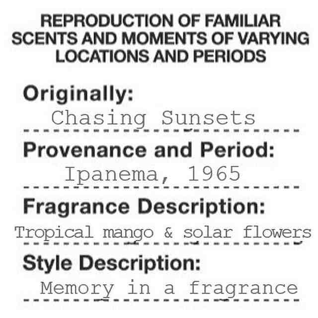 REPRODUCTION OF FAMILIAR SCENTS AND MOMENTS OF VARYING LOCATIONS AND PERIODS Originally: Provenance and Period: Tpanema, 1965 Style Description: Memory 1n a Fragrance