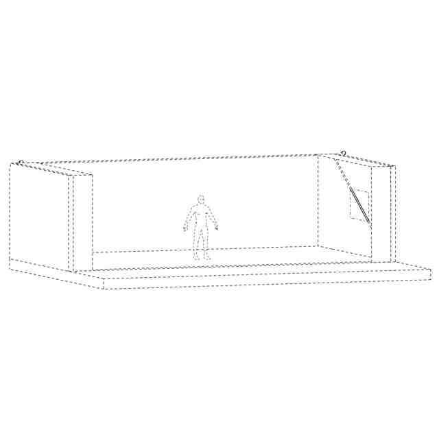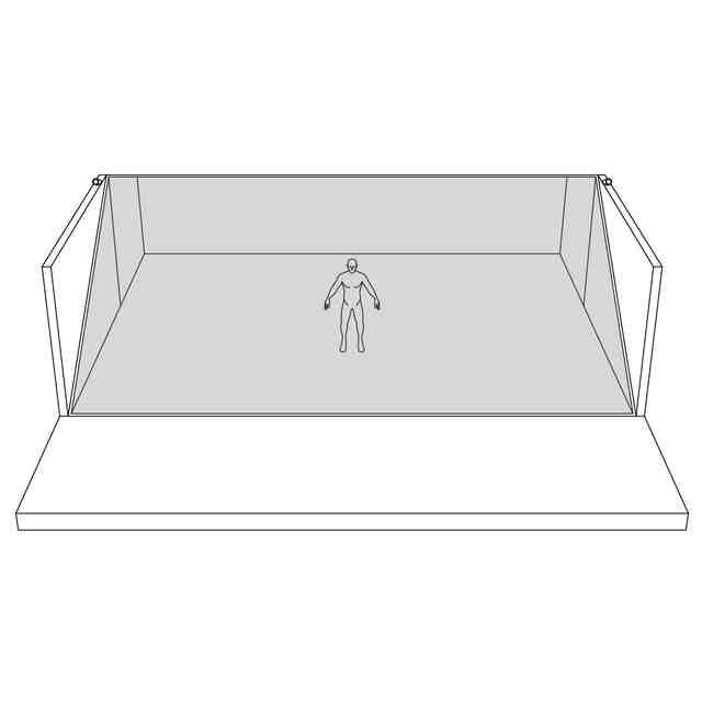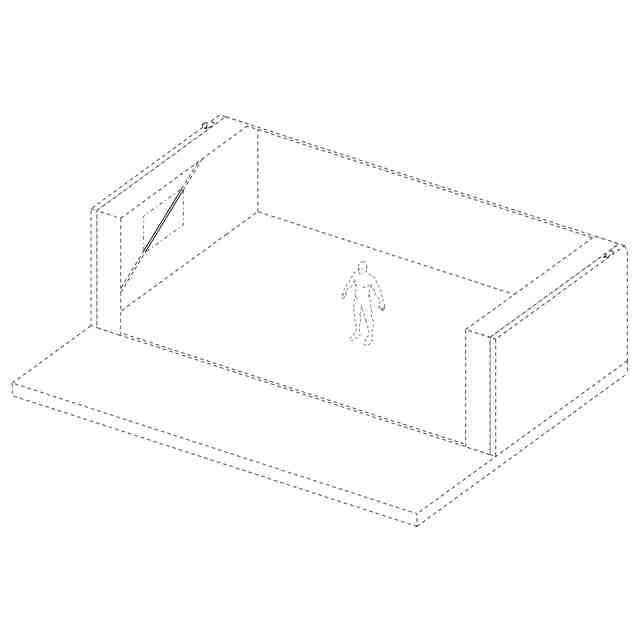 一点鎖線と実線で囲んだ部分(壁を表した画像部分の一部と参考図1において引出線1で示す立壁の一部)が部分意匠として意匠登録を受けようとする部分である。実際の壁と一体的に認識されるように壁の画像を表示することにより、ユーザにおいて、立体画像の実在感が増す。各図において破線で表した人物の画像は本願物品の機能から独立したコンテンツである。右側面図は左側面図と対象に現れるので省略する。斜視図4並びに参考図1及び同2は透視図法による。参考図2は参考図1において引出線2で示す部品を取り外した状態の図である。本願は、本願物品の物理的な構成要素と、ユーザにおいてこれと一体的に認識される画像とが結合した態様について意匠登録を受けようとするものである。