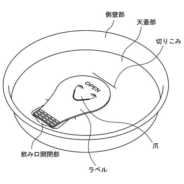 本意匠に係る物品は、包装用容器に取り付けられて用いられる蓋である。この蓋は、平面図や右側面図、A-A線断面図、斜視図1に示すように、天蓋部と、この天蓋部の周縁部分に設けられて該天蓋部と接合一体化された側壁部とを備えている。また、天蓋部には飲み口を開閉するための飲み口開閉部が形成されており、この飲み口開閉部にはラベルが接合されている。参考断面図及び斜視図2に示すように、飲み口開閉部が開いて飲み口が開口した状態は、ラベルに形成された爪が切りこみに差し込まれて維持される。また、ラベルには人物の表情を模した図柄が描かれており、斜視図1に示す飲み口開閉部が閉じた状態のときの表情と斜視図2に示す飲み口開閉部が開いた状態のときの表情とが変化するようになっている。