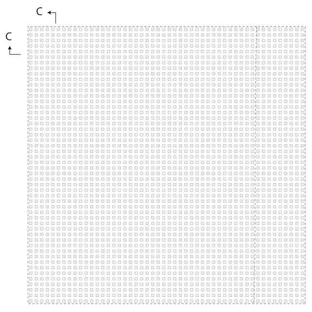 本願意匠に係る物品は微細なLED素子を光源とするディスプレイユニットであり、単体でも機能するものの、通常は複数を組み上げて用いる。多くを組み合わせれば大画面となり、少数のユニットで比較的小さな画面を構築することも可能である。本願物品は、その画面上に視認されるように、写真、絵画、その他種々のグラフィカルな加飾を施した層(以下「加飾層」という。)を具えており、光源となるLED素子周辺において僅かに開口する。そのため、実施態様の一例を示す参考図に表すように、本願物品の非通電時には当該加飾層上の装飾のみが視認され、通電時にはディスプレイに映し出される映像のみが視認される(C-C部分参考拡大図において、引出線1で示す部分が開口部、同2はディスプレイ面、同3はLED素子、同4が加飾層表面である。)。このように、本願物品は映像などを映すディスプレイ装置として、併せて建築物の内外壁等に埋め込んで用いる加飾用の材として機能する。具体的な使用場面は様々あるが、例えば住居のリビングの内壁に用いれば、テレビジョン放送等の視聴のためのディスプレイとして用いることができる一方で、視聴をしていないときにはそれがそのまま壁となるので、リビングにテレビジョン受像機を置く必要がなくなり、リビング空間の構成に自由度が増すことになる。