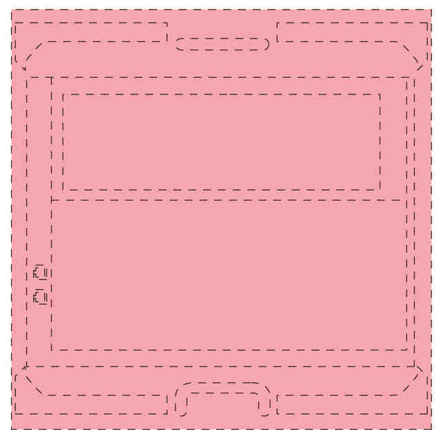 A-B部分領域内において一点鎖線で囲んだ部分(同領域内において一点鎖線で囲んだ開口部周辺の加飾層、実線で表した開口部に現れるディスプレイ面。ただし実線で表した開口部内において破線で表したLED素子は除く。)が部分意匠として意匠登録を受けようとする部分である。A-B部分領域の外(正面図、背面図、右側面図及び平面図において赤色で着色した部分)及び開口部内のLED素子は意匠登録を受けようとする部分に含まない。正面図及びA-B部分拡大図において破線で表した模様は、意匠登録を受けようとする部分に含まない。開口部及びLED素子は極く微細であり、正面図において(出願に用いるイメージファイルに関して許容されている画素密度では)これらを精緻に表すことができないため、同図においてはこれらを薄墨の彩色によって代替的に表している。A-B部分領域内においては、C-D部分拡大図に示す開口部、LED素子及び開口部周辺の一点鎖線が、正面視右方向にC-D部分のそれを含めて10回連続して現れる(C-D部分参考拡大図における薄墨の着色は意匠登録を受けようとする部分を表しているが、この右方向に10回連続するその全体が意匠登録を受けようとする部分である。)。各図における一点鎖線は意匠登録を受けようとする部分とそれ以外の部分の境界のみを表している。左側面図及び底面図は意匠登録を受けようとする部分以外の部分のみ現れるので省略する。