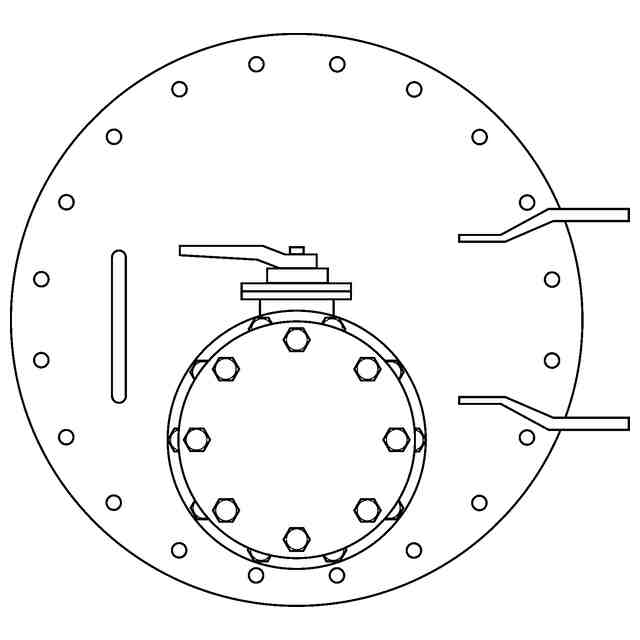 本物品は、タンク内部に堆積した鉱石スラリー等の残渣を除去するためのバキューム用マンホール蓋であって、その形状的特徴は使用状態を示す参考図、斜視図等に示すように、タンク側面下部のマンホール部に着脱する大径の円板からなる蓋体にノズルとバルブが接続され、タンク内のスラリーを全量払い出した後に、バルブを操作してタンク内部の残渣を吸引除去する方式となしたものである。