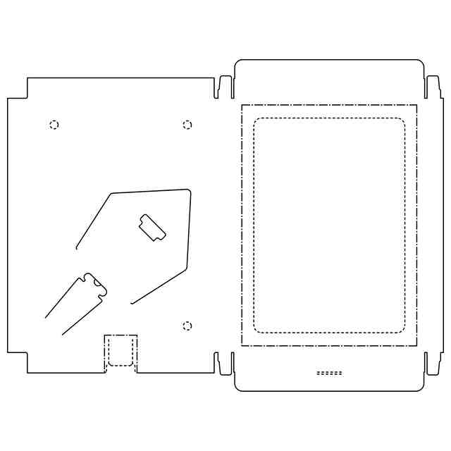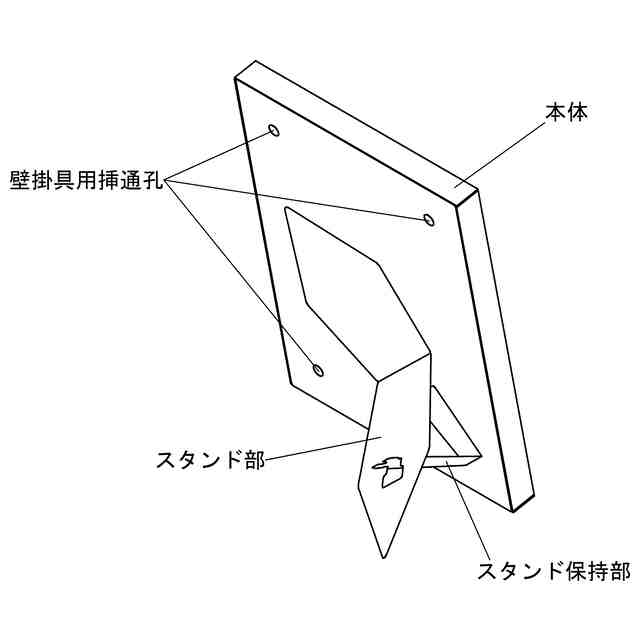 本物品は、組み立てて、例えばTシャツ等の布製品の額装に用いることができるものであり、厚紙製又は樹脂製である。使用状態を示す参考図1及び2に示すように、組み立てた本物品のスタンド部は縦置き状態及び横置き状態で本体を支持することができる。スタンド部を使用する時は、スタンド部及びスタンド保持部を起こして係合させる。