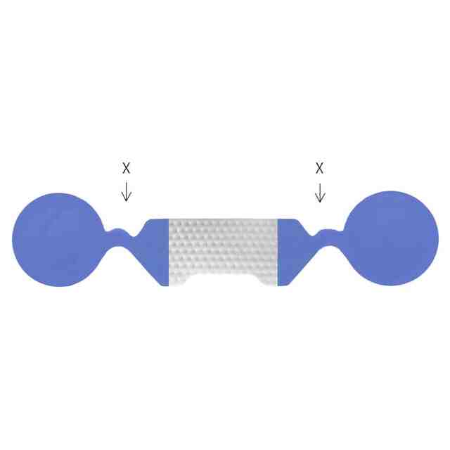 本件意匠の意匠登録を受けようとする部分は、本体(ライナー紙等)、フィルムシート、接着剤、剥離紙等を積層し圧着した鼻腔拡張部の模様に係る。「正面図」乃至「X-X間の拡大部分正面図」において青色で着色した部分以外の部分が、意匠登録を受けようとする部分である。「B-B、C-C間のA―A線拡大断面図」において実線で表された部分が、意匠登録を受けようとする部分である。左側面図は右側面図と、底面図は平面図と対称に表れるため省略する。「名称を示す参考図」は正面図の中央横断面を示す。