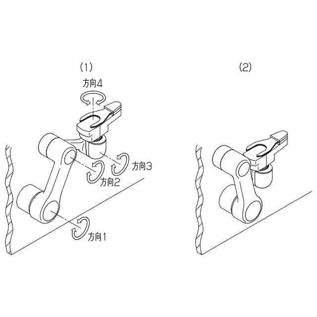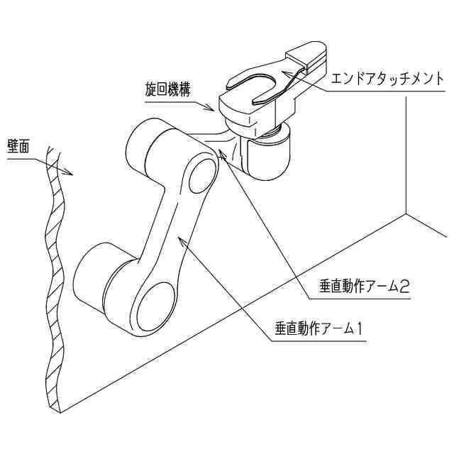 この意匠に係る物品は、産業ロボット用アームであって、半導体ウェハ等を搬送するロボットに使用されるものである。本物品は、垂直動作アーム1及び2を備えており、使用状態を示す参考図に示すように、垂直動作アーム1の端部を壁面に取付け、垂直動作アーム2の先端に旋回機構を取付けて使用することができる。また、本物品は、アームをコンパクトに折り畳むことができるとともに、アーム伸長時は動作範囲を広く確保することができる。動作状態を示す参考図に一例を示すように、垂直動作アーム1及び2は、垂直動作軸を「方向1」~「方向3」で示す方向にそれぞれ回転することにより、旋回機構を水平状態に保ちつつ位置を変位させることができる。