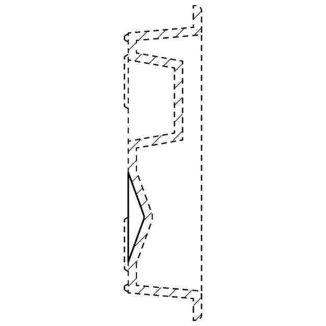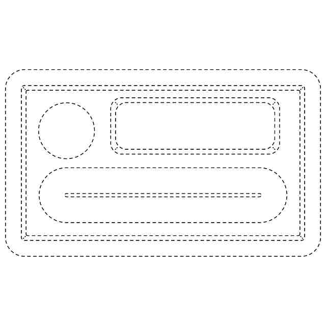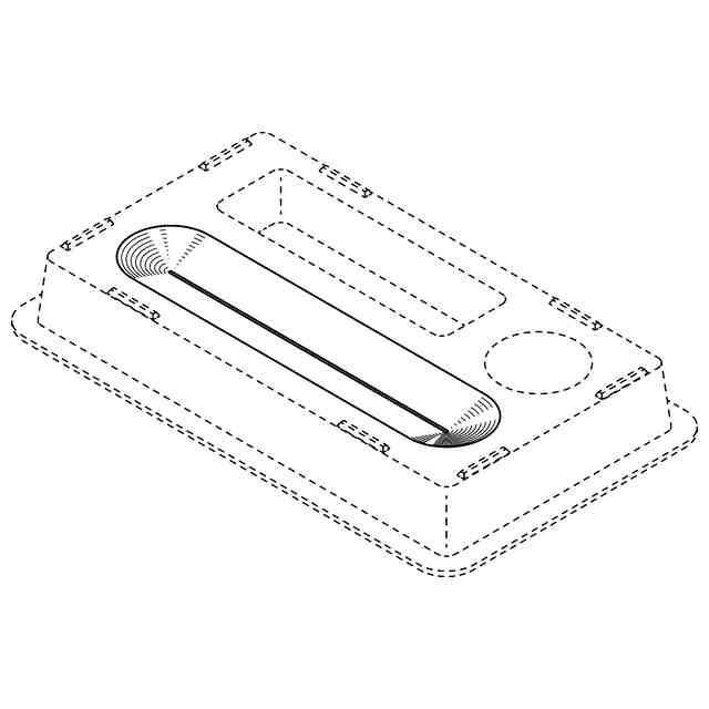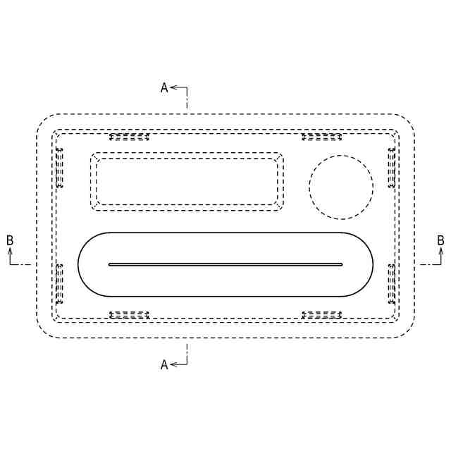 実線で表された部分が、部分意匠として登録を受けようとする部分である。A-A断面図は、正面図に示すA-A線にて切断した断面を表し、B-B断面図は、正面図に示すB-B線にて切断した断面を表している。斜視図は、正面、右側面、底面を示す図であり、斜視図で示す収容部の長尺方向の両端部に示された断続的な放射状の細線は、立体表面の形状を特定するためのものである。なお、右側面図は、左側面図と対称に表れ、底面図は、平面図と対称に表れるので、これらを省略する。