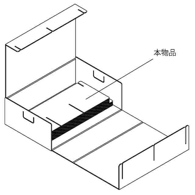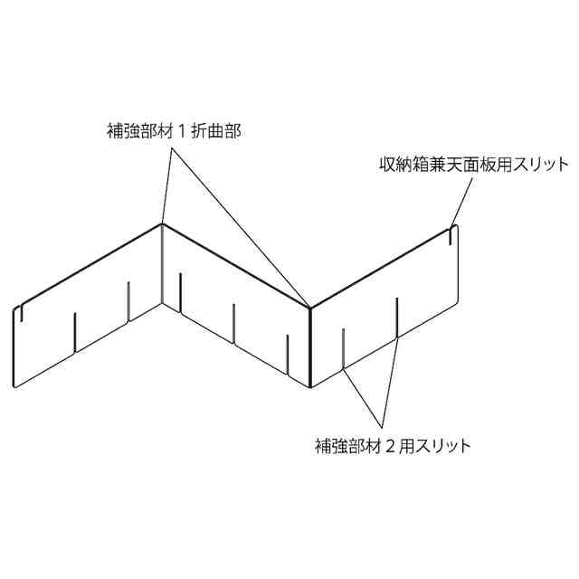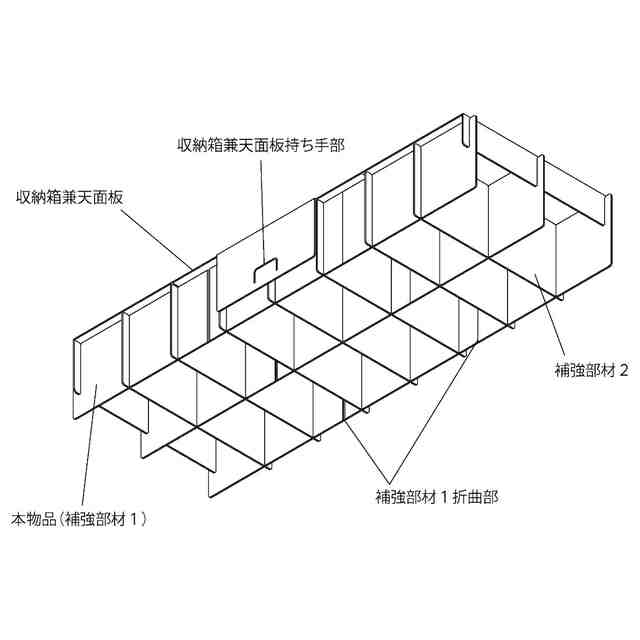 本物品は、「使用状態参考図2」「使用状態参考図3」及び「各部の名称を示す参考図」に示すように収納箱兼天面板と補強部材1(本物品)の各スリットどうしを挿入し、当該補強部材1と補強部材2のスリットどうしを挿入して使用する組立ベッド用部材である。本物品は折曲部を有しコンパクトに折り畳むことができ、「使用状態参考図1」に示すように収納箱兼天面板内に収納して保管することが可能である。