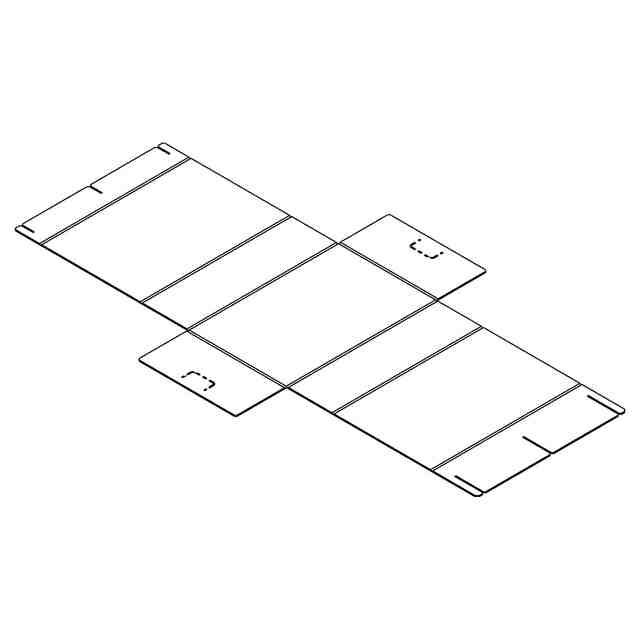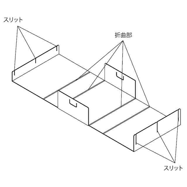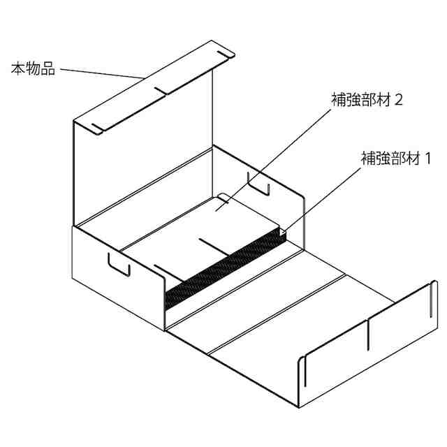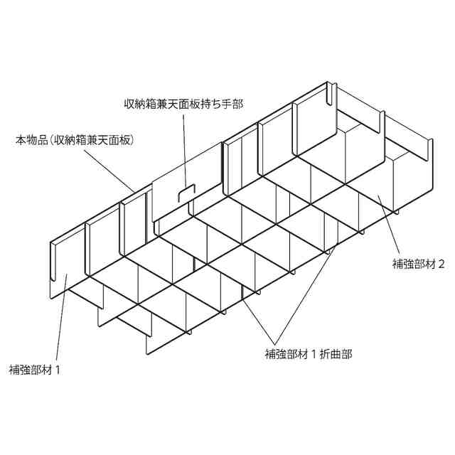 本物品は、「使用状態参考図2」「使用状態参考図3」及び「各部の名称を示す参考図」に示すように収納箱兼天面板(本物品)と補強部材1の各スリットどうしを挿入し、当該補強部材1と補強部材2のスリットどうしを挿入して使用する組立ベッド用部材である。本物品は折曲部を有し、「使用状態参考図1」に示すように各パーツを収納してコンパクトに保管及び運搬することが可能である。