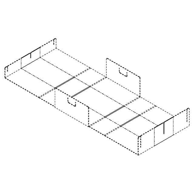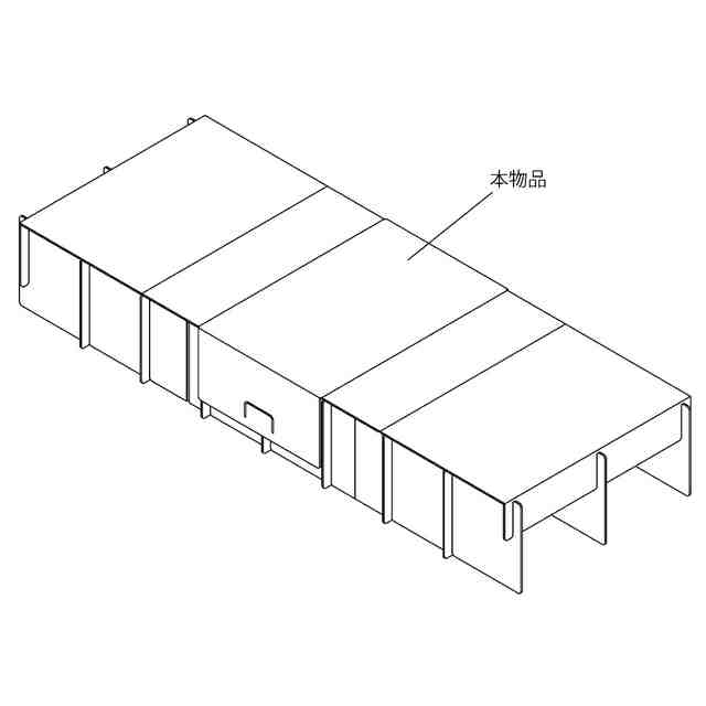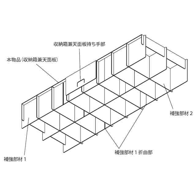 本物品は、「使用状態参考図2」「使用状態参考図3」及び「各部の名称を示す参考図」に示すように収納箱兼天面板(本物品)と補強部材1の各スリットどうしを挿入し、当該補強部材1と補強部材2のスリットどうしを挿入して使用する組立ベッド用部材である。本物品は折曲部を有し、「使用状態参考図1」に示すように各パーツを収納してコンパクトに保管及び運搬することが可能である。