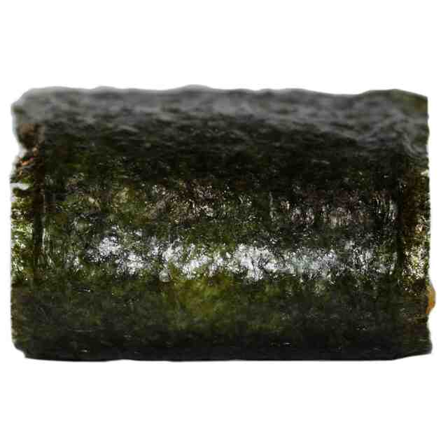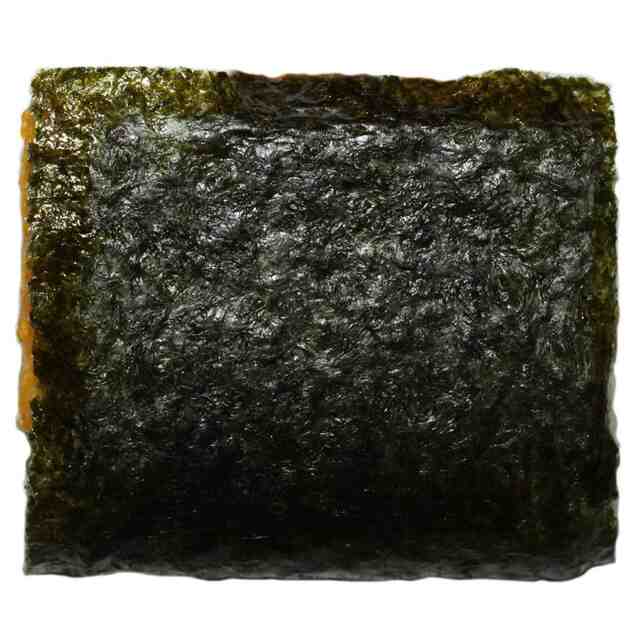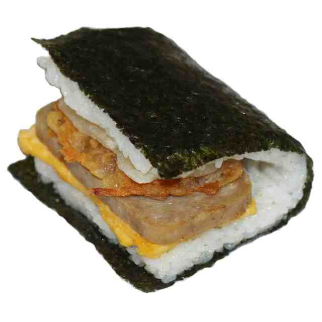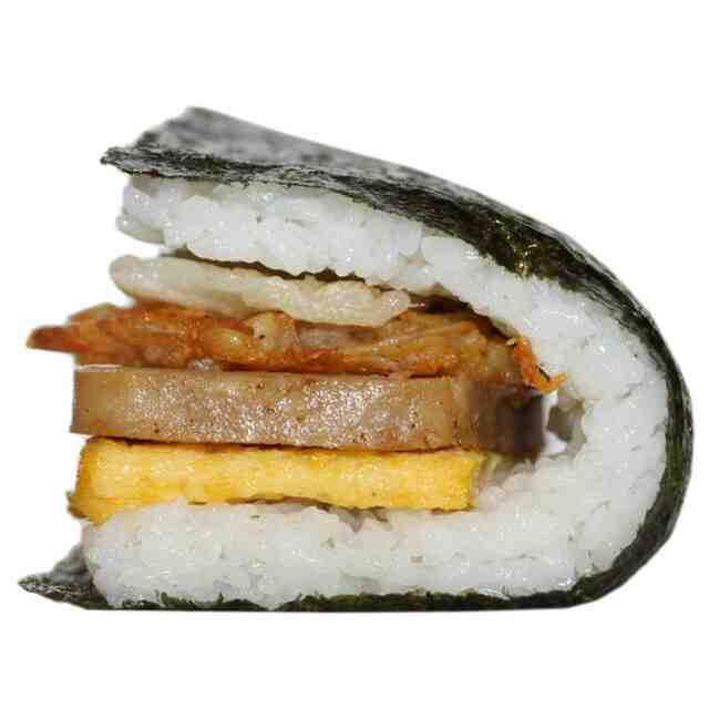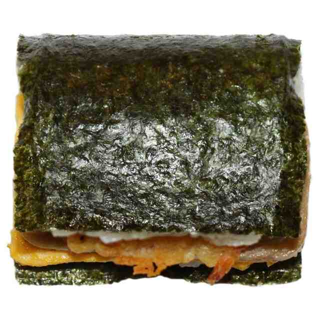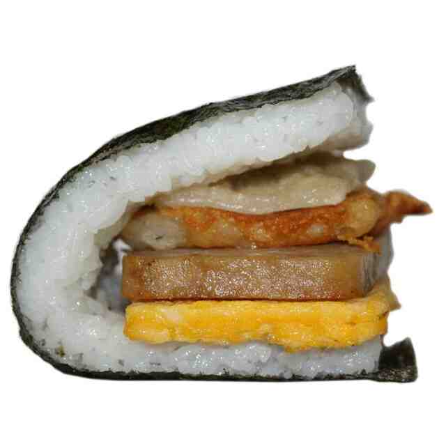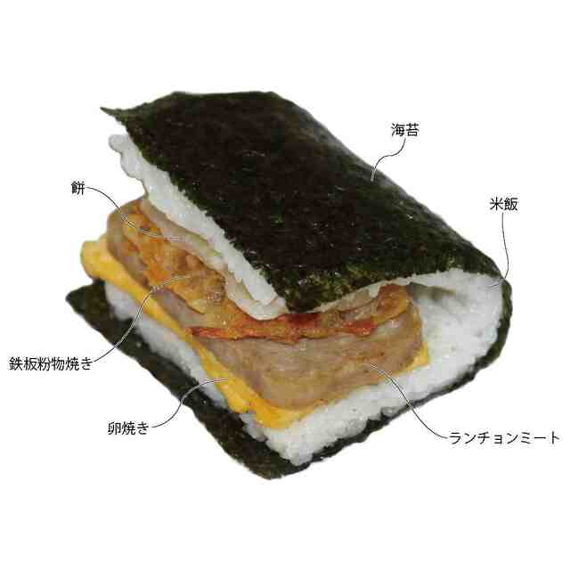 本物品は、2つ折りした扁平状の海苔付き米飯の間に、複数の具材を挟み込んだおにぎりである。各部の名称を示す参考図のように、上下の米飯の間の各具材はそれぞれ、餅、もんじゃ焼き又はお好み焼きなどの鉄板粉物焼き、卵焼き、ランチョンミートである。本物品は、斜視図、正面図、右側面図及び左側面図に示すように各具材の全てが、斜め上側、正面側及び左右側面から視認できる。