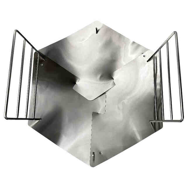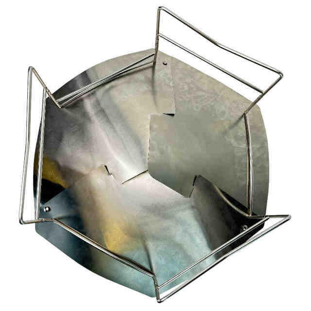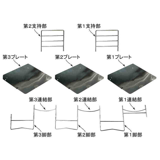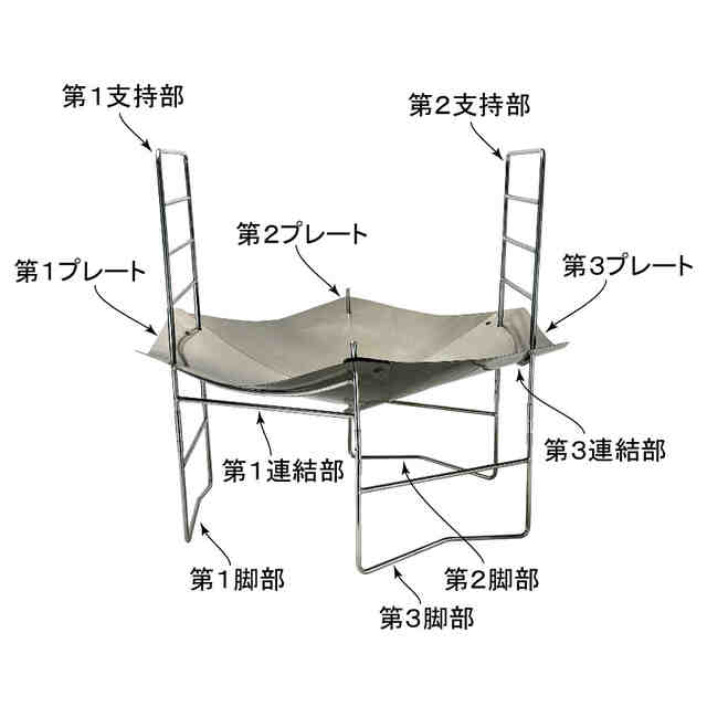 参考図1は、本物品に係る焚火台の各部品の名称を記載した正面図であり、参考図2は、各部品の形状を示す分解図である。本物品に係る焚火台は、参考図2に示す各部品を組み合わせることによって構成される。
