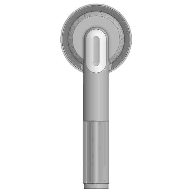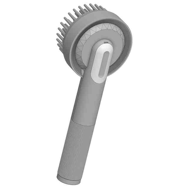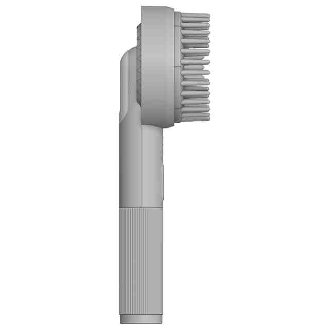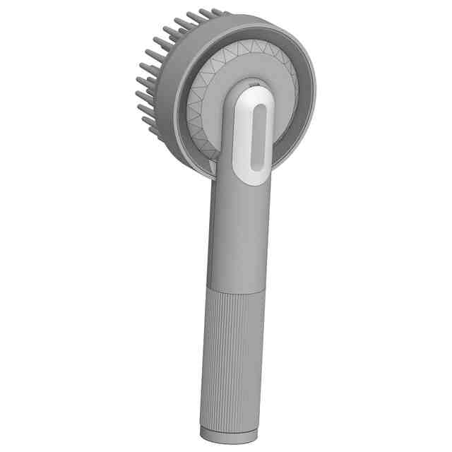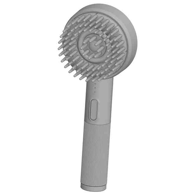 当該意匠に係る物品の材料は、金属と合成レジンである。 また、当該意匠に係る物品は、コーム形状であって頭部マッサージ用の振動するヘアブラシである。 創作のポイントは、マッサージ用コームの形状と形状の組合せである。