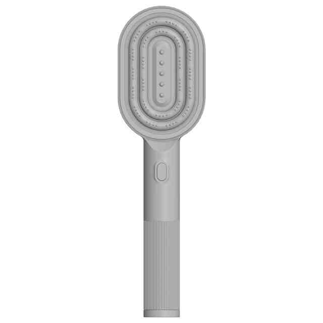 当該意匠に係る物品の材料は、金属と合成レジンである。 また、当該意匠に係る物品は、コーム形状であって頭部マッサージ用の振動するヘアブラシである。 創作のポイントは、頭髪育成用コームの形状と形状の組合せである。
