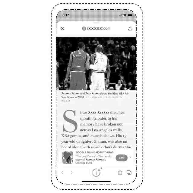 本物品は、検索機能と情報アクセス機能を有する。正面図及び部分拡大図に表された画像は吹き出し状のプロンプトを含んでおり、ユーザーはこれをアクセスポイントとして検索インターフェース内の追加情報にアクセスすることができる。