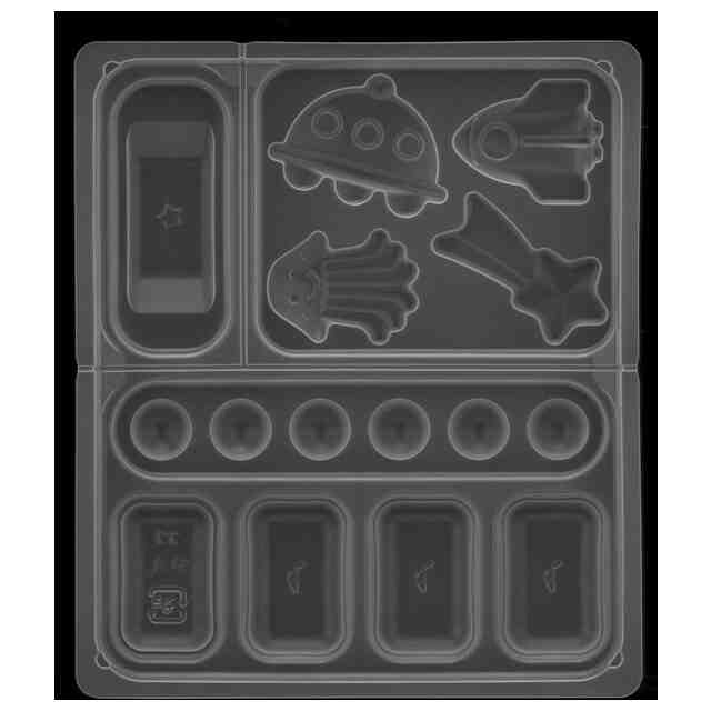 本物品は、成型菓子の調製に用いるトレーであって、正面図に示すように、上段に2個の略長方形凹部、中段に6個の円形凹部、下段に4個の略長方形凹部を有する。上段右側の略長方形凹部の底面には、動植物、乗り物、流れ星等のキャラクターを表現した凹部が形成されている。