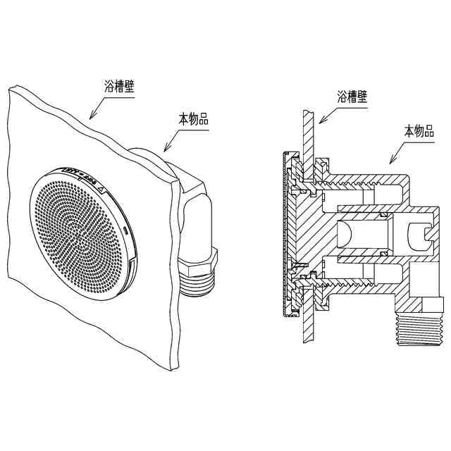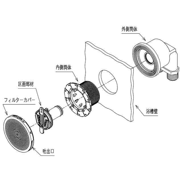 この意匠に係る物品は、浴槽の側壁に取り付けられ、浴槽と加熱器との間で湯水を循環させる浴槽用循環具である。本願意匠において意匠登録を受けようとする部分は、内側筒体に組み付けられ、浴槽の内側に配置されるフィルターカバーの表面部分である。