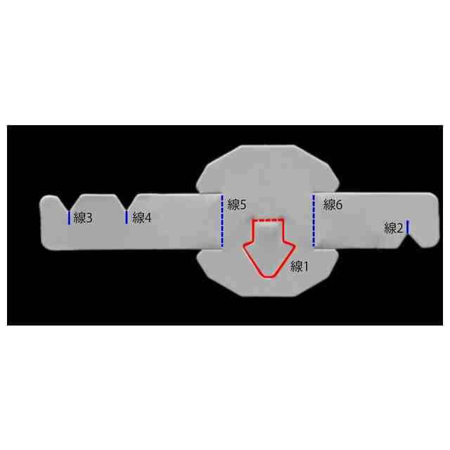 本物品は、ゼリーのような柔軟な菓子を固定できる、1枚のシートから組み立てて作成される組立式菓子用台座である。参考展開図2に示すように、該組立式菓子用台座のシートには、4ヶ所の切り込み(線1の実線部、線2、線3及び線4)と、谷折り線(線1の破線部)と、山折り線(線5、線6)とが形成されている。前記谷折り線を谷折りし、前記山折り線をそれぞれ山折りした後、切り込み線2に対し切り込み線3(または切り込み線2に対し切り込み線4)を嵌合すると、六面図、正面斜視図及び背面斜視図に示すような菓子用台座を作成できる。なお、平面図や底面図に示すような谷折りして形成された矢印形状の突起物を、菓子に差し込むことで該菓子を固定する。