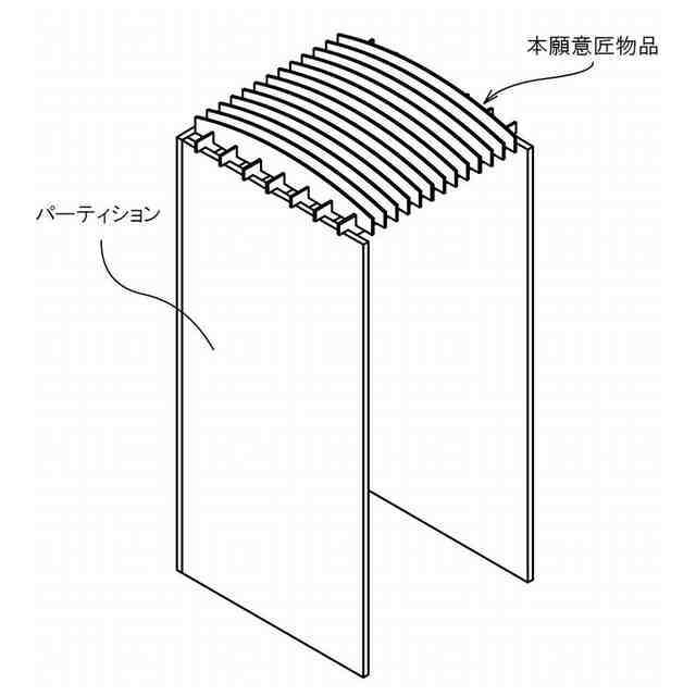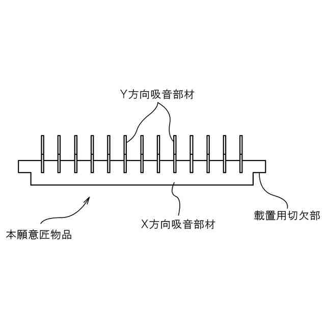 本願意匠に係る物品は、例えば、パーティション等で仕切られたスペースの上部に設置して使用される吸音部材であって、「各部の名称を示す参考分解右側面図」に示すように、パーティション上部に載置されるX方向吸音部材と、該X方向吸音部材を挟持するためのY方向吸音部材とで構成されている。Y方向吸音部材は、該Y方向吸音部材の下部に設けた複数の挟持用切欠部のそれぞれでX方向吸音部材を挟持しつつ、X方向吸音部材に対し、着脱自在且つX方向吸音部材の長さ方向にスライド自在(角度、位置)に設けられる。